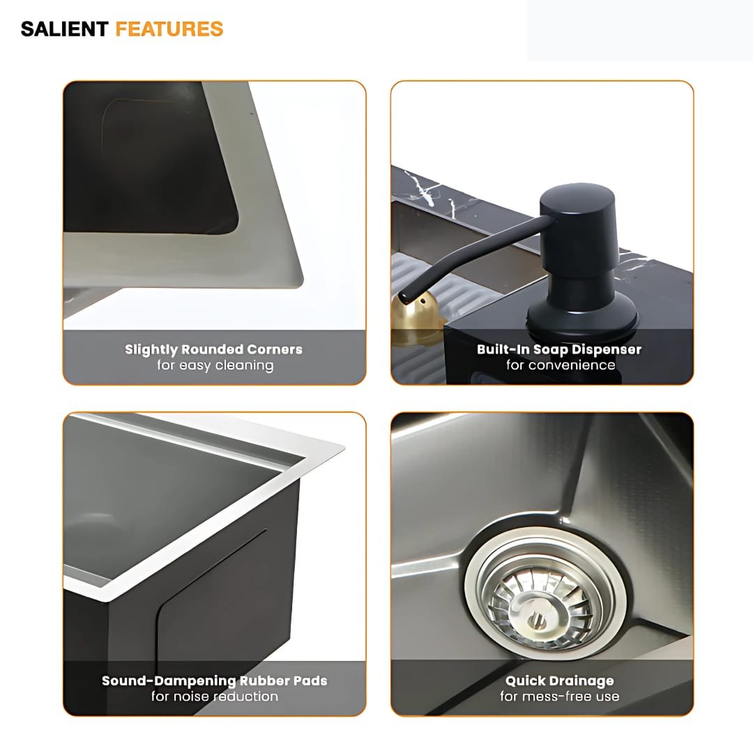 【Multiple detail designs】: Diagonal streamlines can quickly drain water to prevent water accumulation in the sink; thickened sound insulation pad and protective bottom layer absorb noise and vibration when the sink is in use; overflow holes prevent accumulated water from overflowing to the countertop , Keep the countertop dry and tidy.