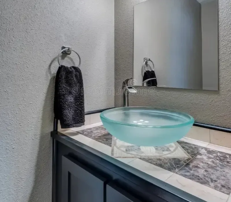 The bowl features a glossy marble-effect finish that enhances any luxury bathroom décor, making it the perfect centerpiece for vanities, guest wash areas, or high-end powder rooms. Its above-counter design creates a bold, modern look while also being easy to install.
