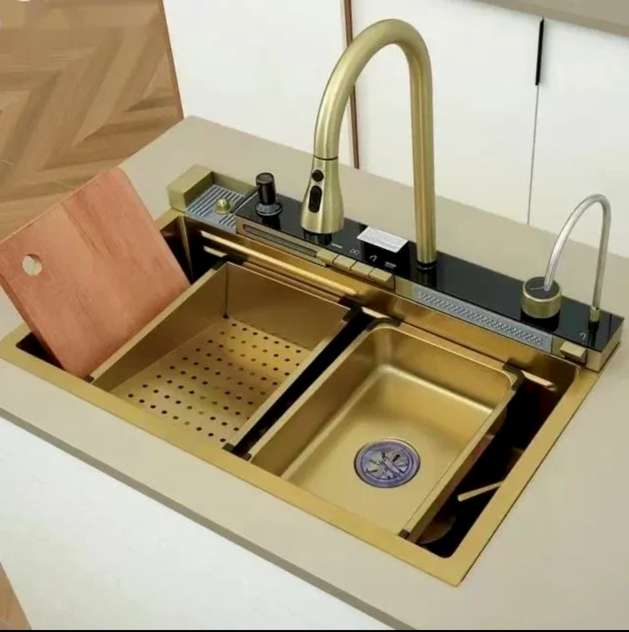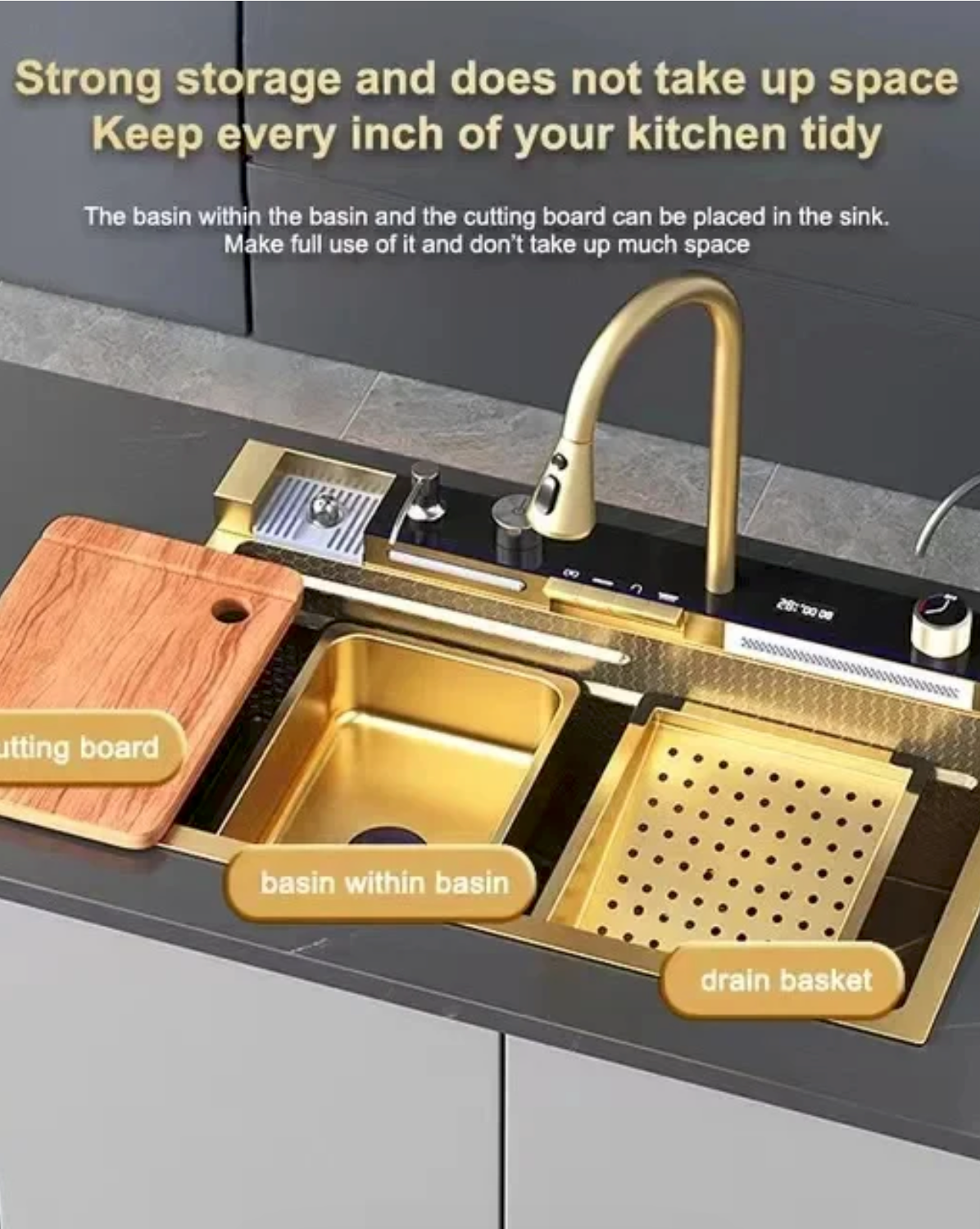 The Luxury Gold Multifunction Kitchen Sink is crafted from high-quality stainless steel with an elegant PVD gold finish that enhances durability and style. Its innovative workstation design allows accessories such as a cutting board and drain basket to slide across the sink, making food preparation easier and more organized.