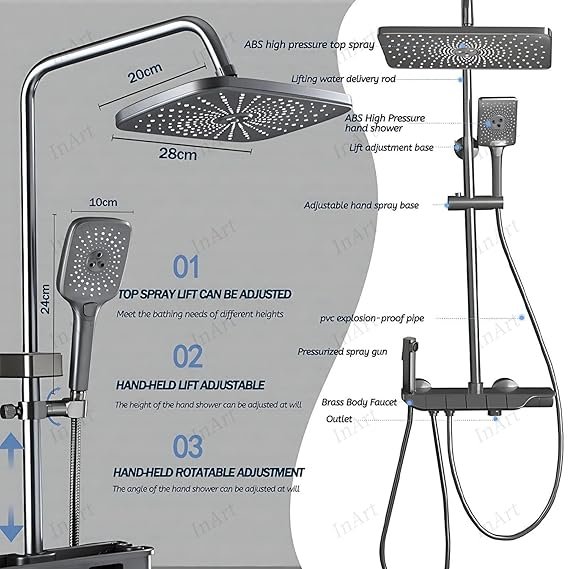 Versatile Shower Experiences: Features multiple shower modes including soothing rainfall, vibrant waterfall, refreshing body massage spray, and a dual-flow hand shower for a personalized bathing experience.